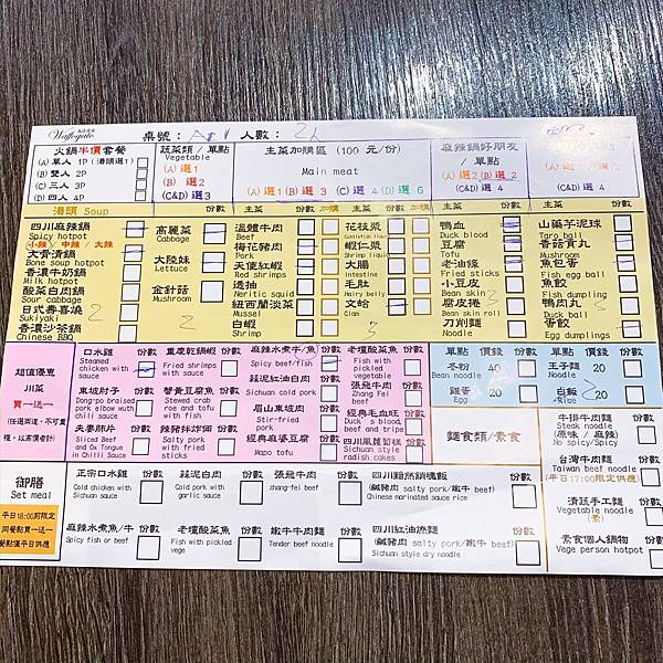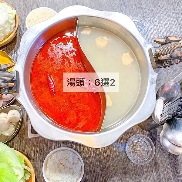 1.湯頭(6選2): 四川麻辣鍋(小辣)、大骨清鍋