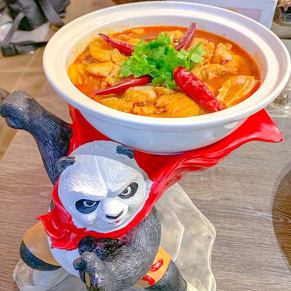 麻辣水煮魚以功夫熊貓的底盤座端上桌~