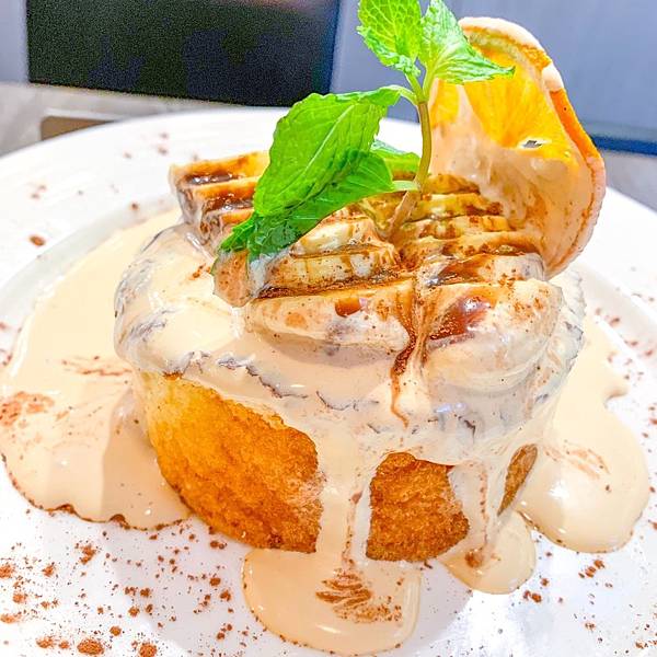 上面擺上香蕉切片淋上巧克力鮮奶油,