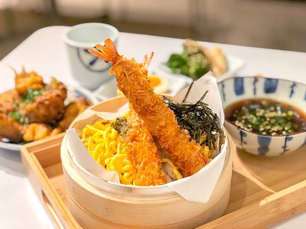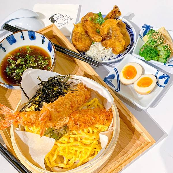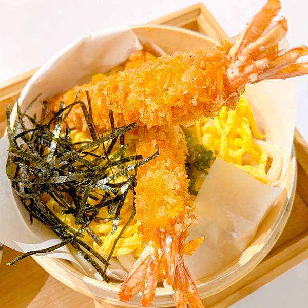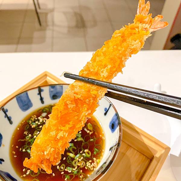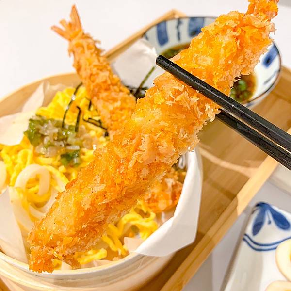 可以將烏龍麵沾著吃,炸蝦也可以沾唷!