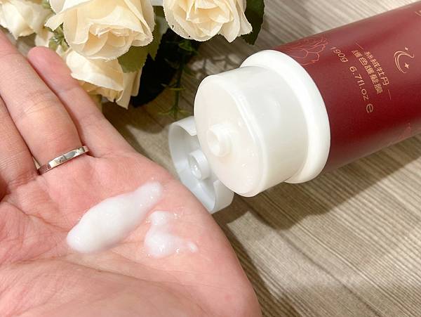 這款絲絨牡丹護色護髮膜擠出後是白色,質地就是偏濃稠的髮膜質地~