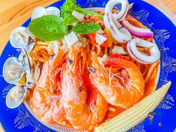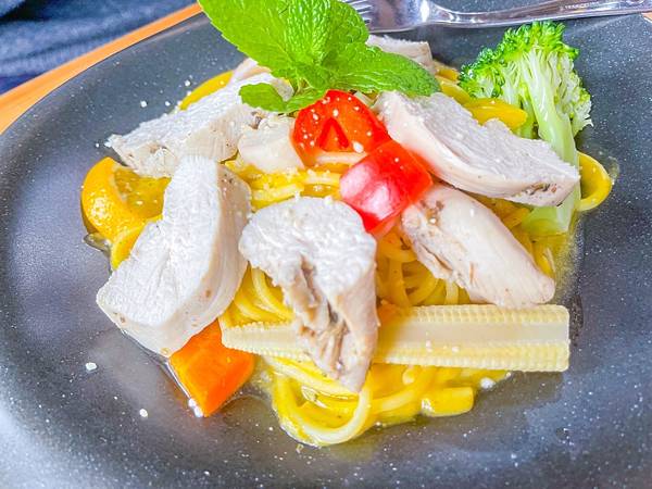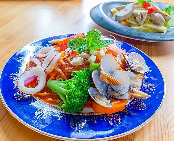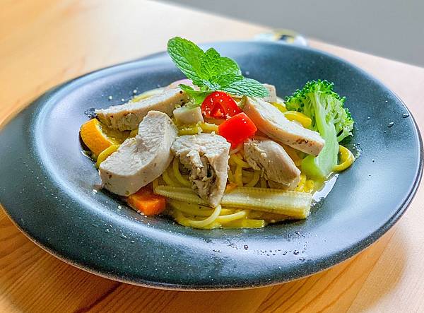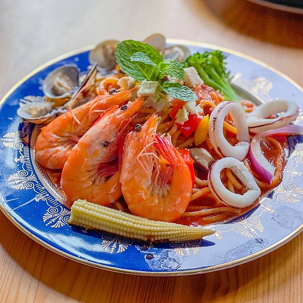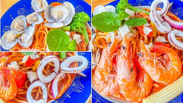 這道是用番茄熬煮的紅醬作為義大麵醬,搭配彩椒、杏鮑菇作為整體醬料的搭配,