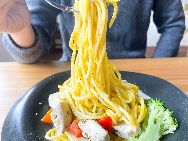 一樣搭配彩椒、杏鮑菇,還有花椰菜、玉米筍,義大利麵麵條一樣都是偏比較粗的圓麵條