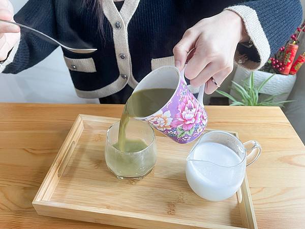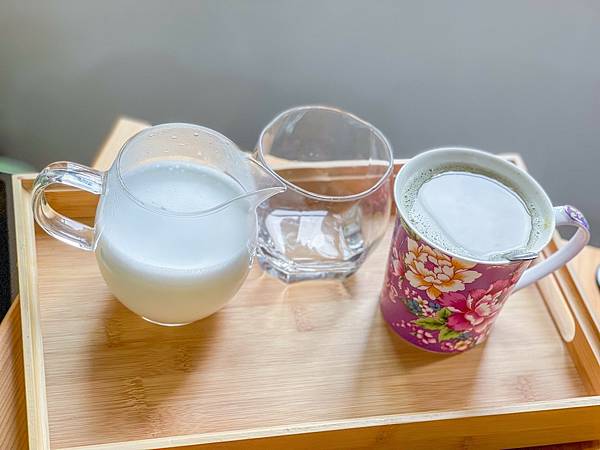 這道非常特別,上桌時會有三個杯子,一杯擂茶、一杯熱牛奶、一個空杯
