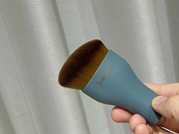 但由於這款水滴型的坡型弧面粉底刷良好的設計,